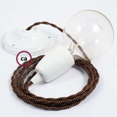 Nuestra lámpara de techo más simple y elegante. Escoge el material y el color del portalámpara y del rosetón para combinar con el cable textil, siempre realizado 100% en Italia: puedes elegir entre más de 10.000 variantes de suspensiones de techo.