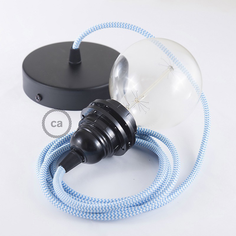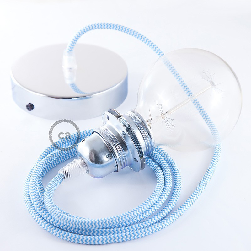 Crea tu pendel para pantalla con el cable textil ZigZag Turquesa RZ11: elige el color del rosetón y del portalámpara, la longitud del cable y si recibirlo ya montado por el personal creative-cables o en forma de kit para el montaje. Los pendels Creative-cables son ideales para dar un toque de estilo y de color a tu hogar.