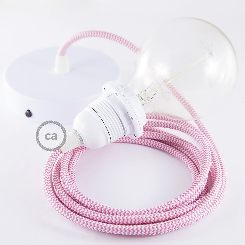 Crea tu pendel para pantalla con el cable textil ZigZag Fuchsia RZ08: elige el color del rosetón y del portalámpara, la longitud del cable y si recibirlo ya montado por el personal creative-cables o en forma de kit para el montaje. Los pendels Creative-cables son ideales para dar un toque de estilo y de color a tu hogar.