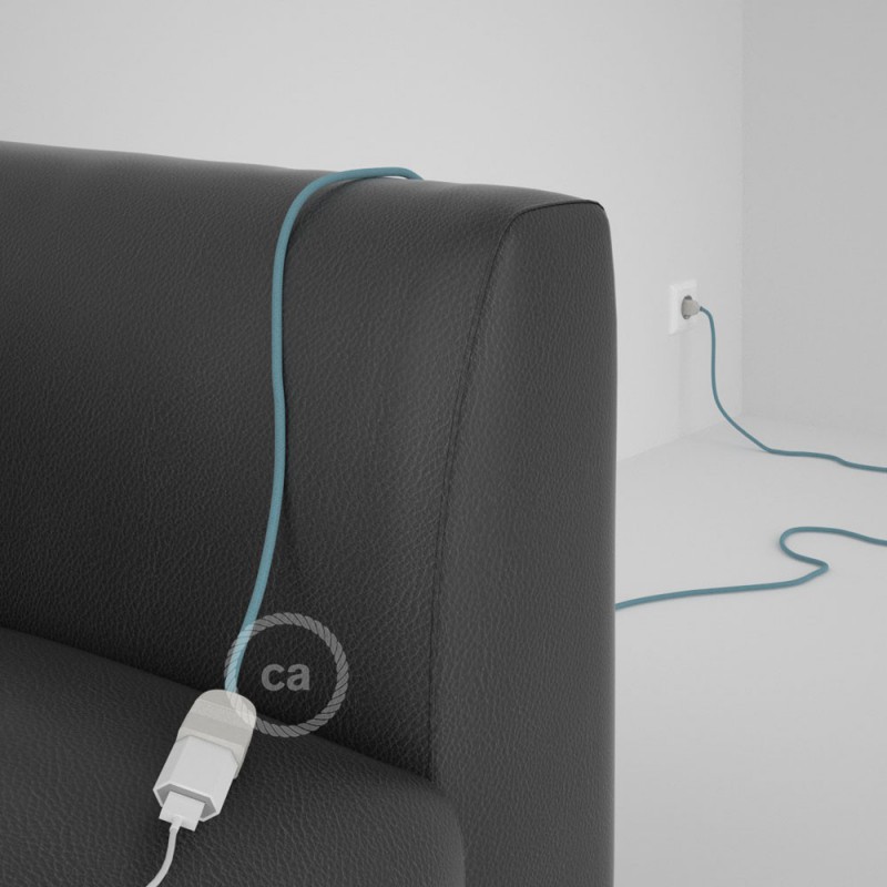 El alargador con cable Redondo RC53 Algodón Oceano de Creative-Cables lleva la corriente eléctrica donde tu quieras y es perfecto para cualquier dispositivo con un clavija con 2 polos: conectar el ordenador portátil, recargar el teléfono móvil o el tablet va a ser mucho más fácil, cómodo y colorado.