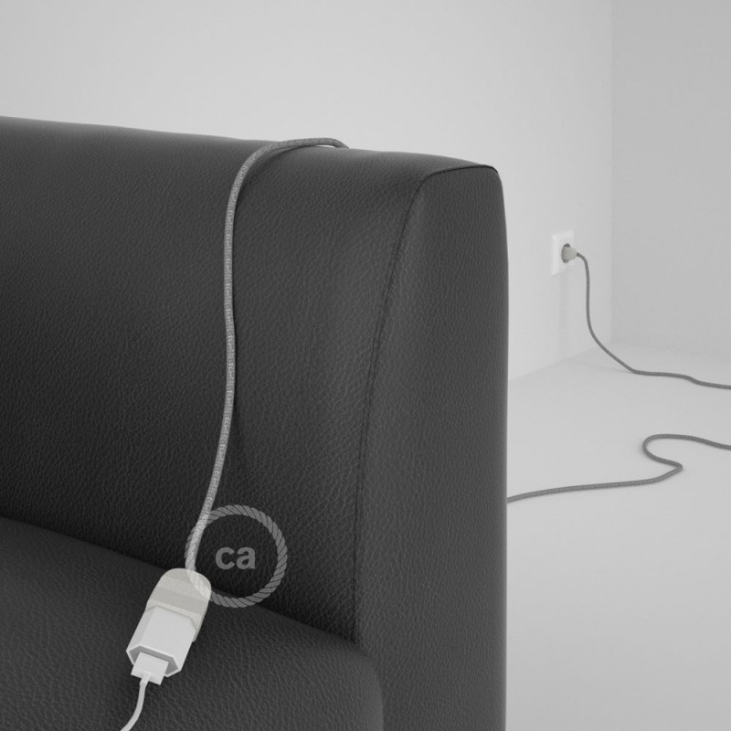 El alargador con cable Redondo RL02 Efecto Seda Glitter Plateado de Creative-Cables lleva la corriente eléctrica donde tu quieras y es perfecto para cualquier dispositivo con un clavija con 2 polos: conectar el ordenador portátil, recargar el teléfono móvil o el tablet va a ser mucho más fácil, cómodo y colorado.