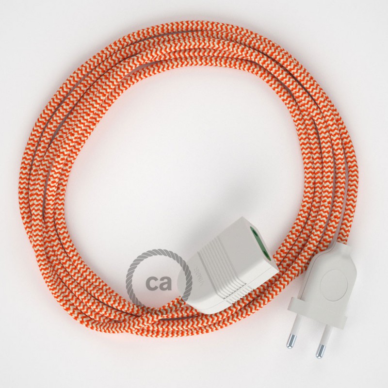 El alargador con cable Redondo RZ15 Efecto Seda ZigZag Blanco Naranja de Creative-Cables lleva la corriente eléctrica donde tu quieras y es perfecto para cualquier dispositivo con un clavija con 2 polos: conectar el ordenador portátil, recargar el teléfono móvil o el tablet va a ser mucho más fácil, cómodo y colorado.