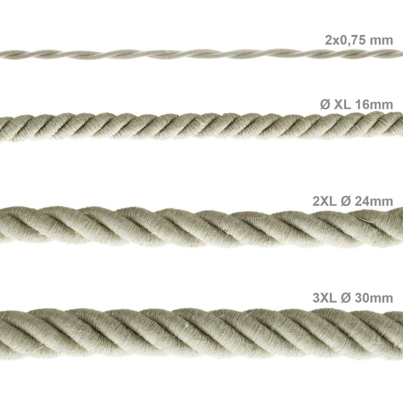 Los cables eléctricos de doble revestimiento están recubiertos por suave flocado y lino natural para alcanzar un diámetro exterior de 30 mm.