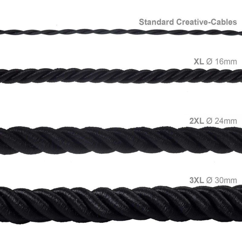Puedes utilizar el cordón 2XL recubierto en tejido negro brillante con los nuevos rosetones y portalámparas de madera natural para crear lámparas colgantes muy originales.