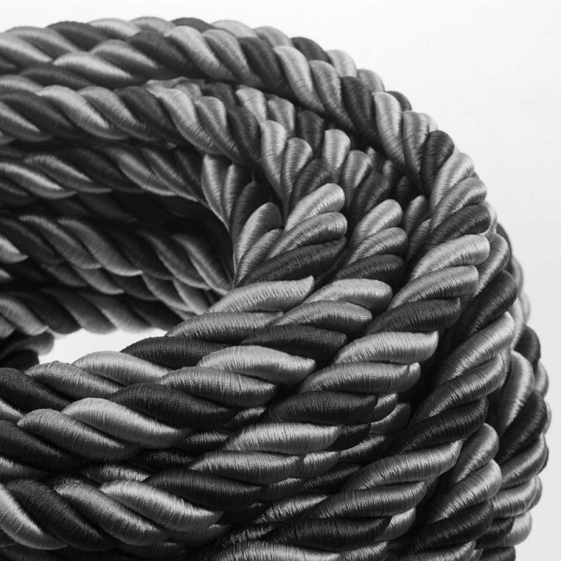 Los cables eléctricos de doble revestimiento están recubiertos de algodón flexible regenerado y de elegante tejido lucído Orleans en tonos grises, hasta un diámetro de 24 mm.