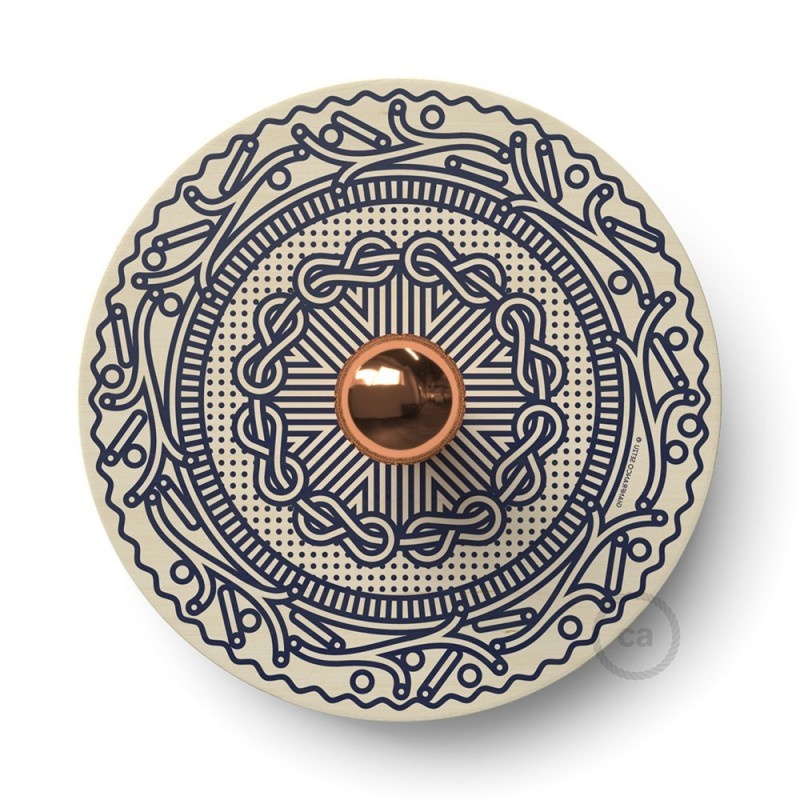 Lámpara de pared con pantalla de la colección UFO (Unconventional Flying Object) fabricada en madera de álamo con diseño ilustrado doble cara nace de la colaboración entre Creative-Cables y las promesas de la ilustración italiana durante FuoriSalone y Milan Fashion Week 2018.