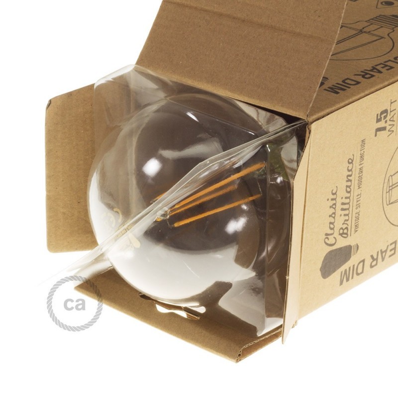 La versión potente y dimmable (es decir, regulable en intesidad) de la línea classic brilliance. La Bombilla Transparente LED Globo G95 Filamento Largo con sus 7,5 watt permite una cantidad de luz igual a una bombilla tradicional de 60W que disminuye al gusto para obtener una atmosfera aun más cálida e íntima.