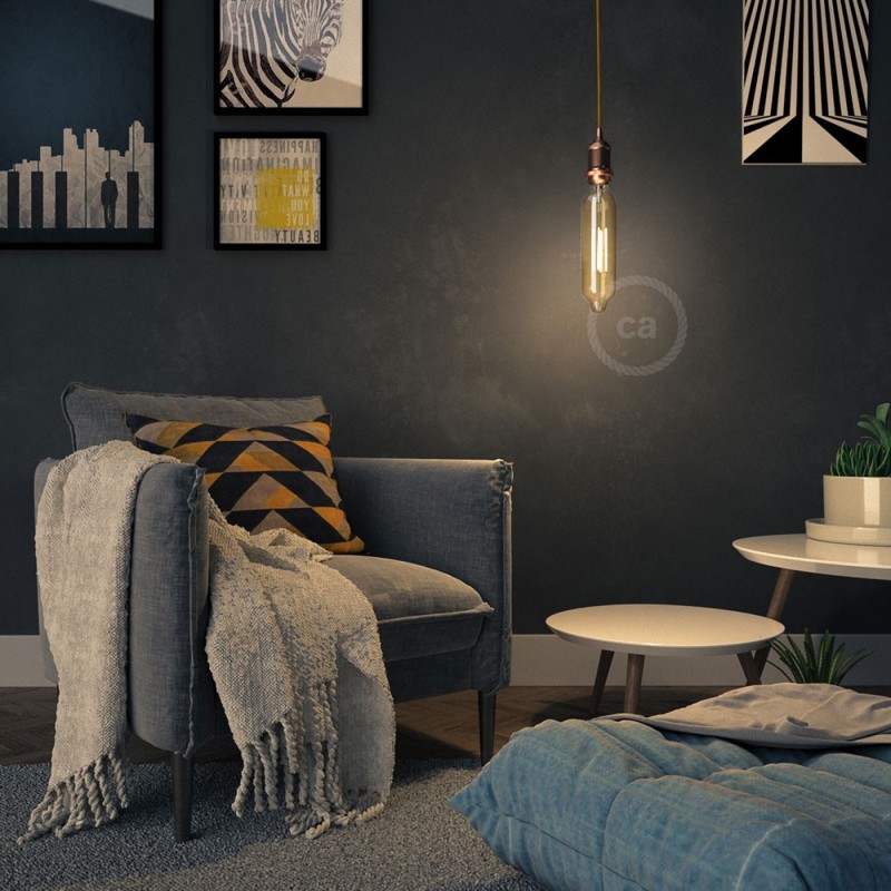 La bombilla dorada LED XXL tubular T75, con su particular forma tubular y dimensiones únicas, es capaz de amueblar e iluminar cualquier habitación por sí misma, con el gran encanto de su luz cálida y dorada.
