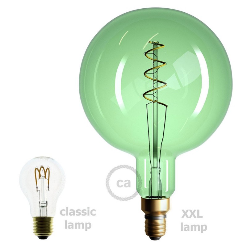La Bombilla Esmeralda LED XXL Esfera G200 Filamento Curvado con Doble Espiral 5W dimmable es el nuevo estándar de las bombillas gigantes.