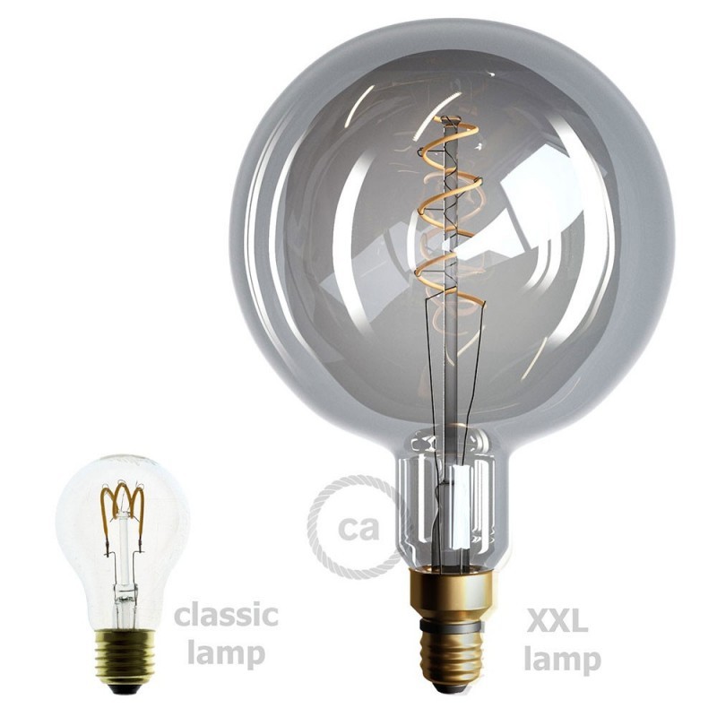 La Bombilla Smoky LED XXL Esfera G200 Filamento Curvado con Doble Espiral 5W dimmable es el nuevo estándar de las bombillas gigantes.