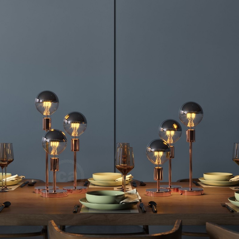 Los tubos de extensión en metal cobre se usan para personalizar creativamente un techo o una lámpara de mesa. Montados cerca de un rosetón o de un portalámparas en metal realzan cualquier suspensión, aplicado a un Posaluce hace que aumente su altura total y posibilita colocar una lampara con pantalla.