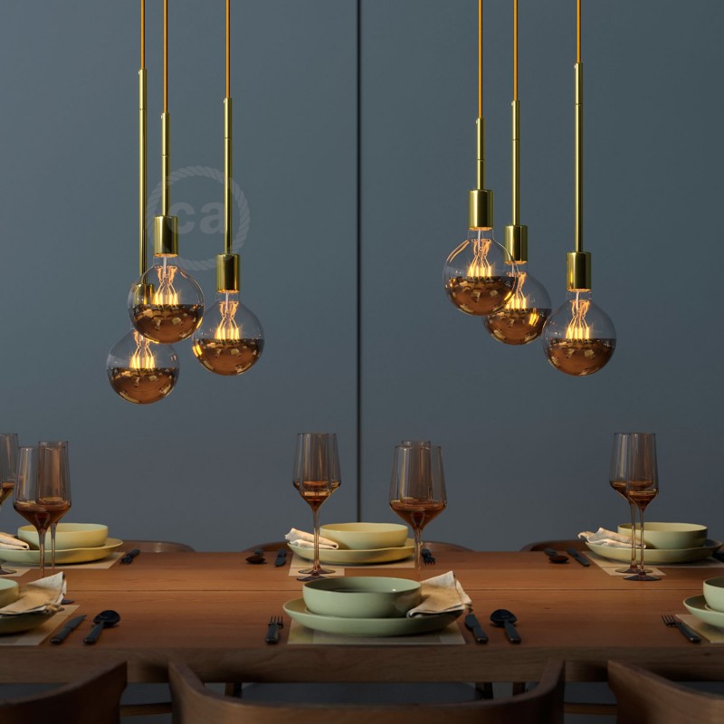 Los tubos de extensión en metal latón se usan para personalizar creativamente un techo o una lámpara de mesa. Montados cerca de un rosetón o de un portalámparas en metal realzan cualquier suspensión, aplicado a un Posaluce hace que aumente su altura total y posibilita colocar una lampara con pantalla.