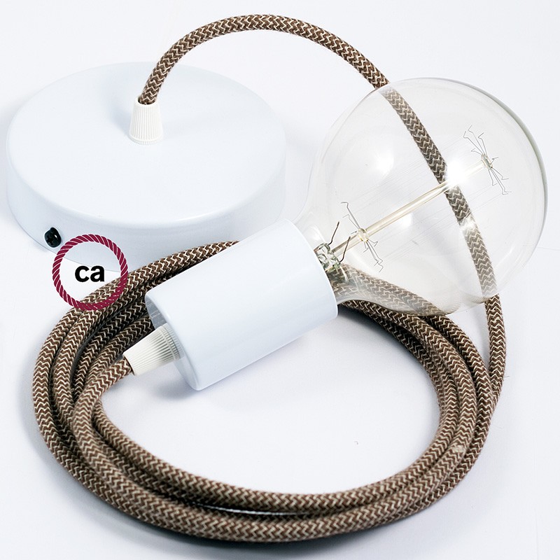 Crea tu pendel con el cable textil ZigZag Corteza RD73: elige el color del rosetón y del portalámpara, la longitud del cable y si recibirlo ya montado por el personal creative-cables o en forma de kit para el montaje. Los pendels Creative-cables son ideales para dar un toque de estilo y de color a tu hogar.