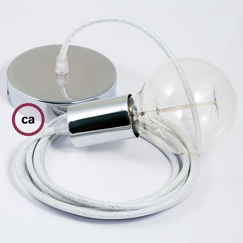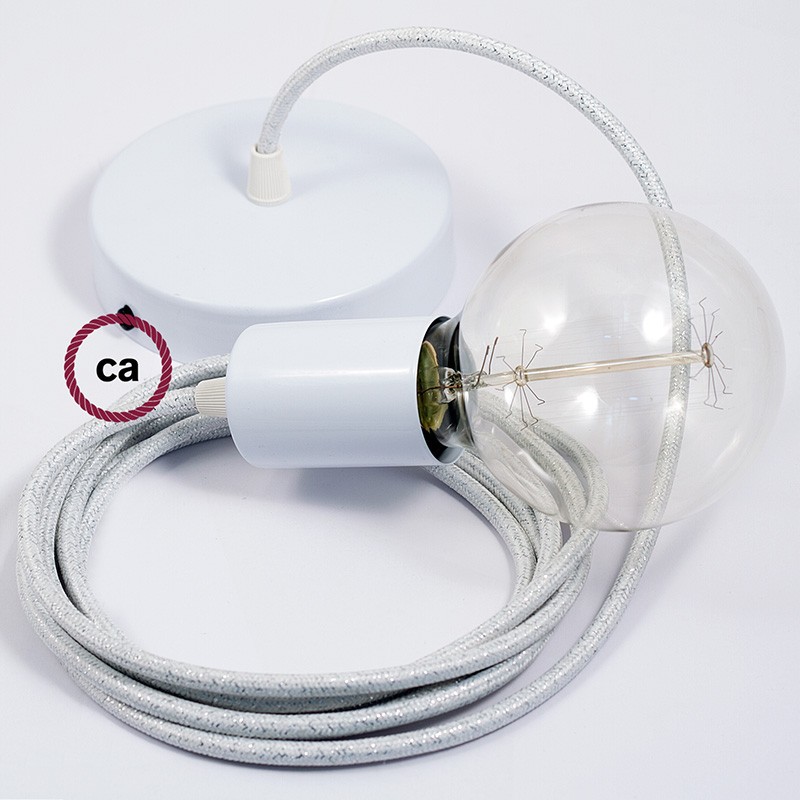 Crea tu pendel con el cable textil Blanco Glitter RL01: elige el color del rosetón y del portalámpara, la longitud del cable y si recibirlo ya montado por el personal creative-cables o en forma de kit para el montaje. Los pendels Creative-cables son ideales para dar un toque de estilo y de color a tu hogar.