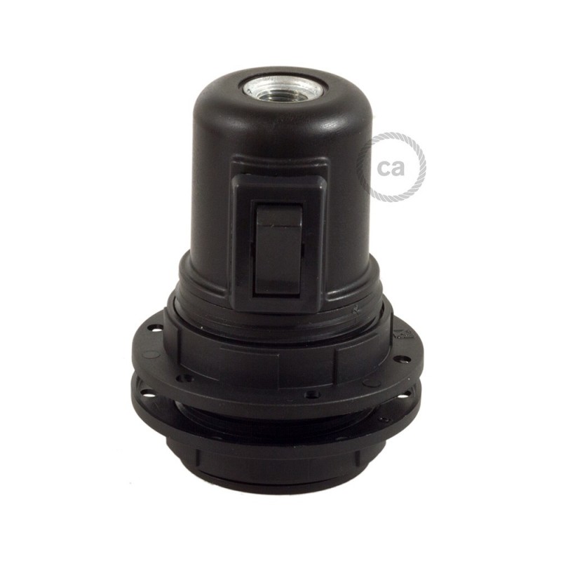 Un portalámparas de termoplástico E27 con interruptor y doble arandela se usa para montar lámparas de pared, de mesa o de techo para pantalla.