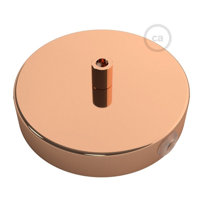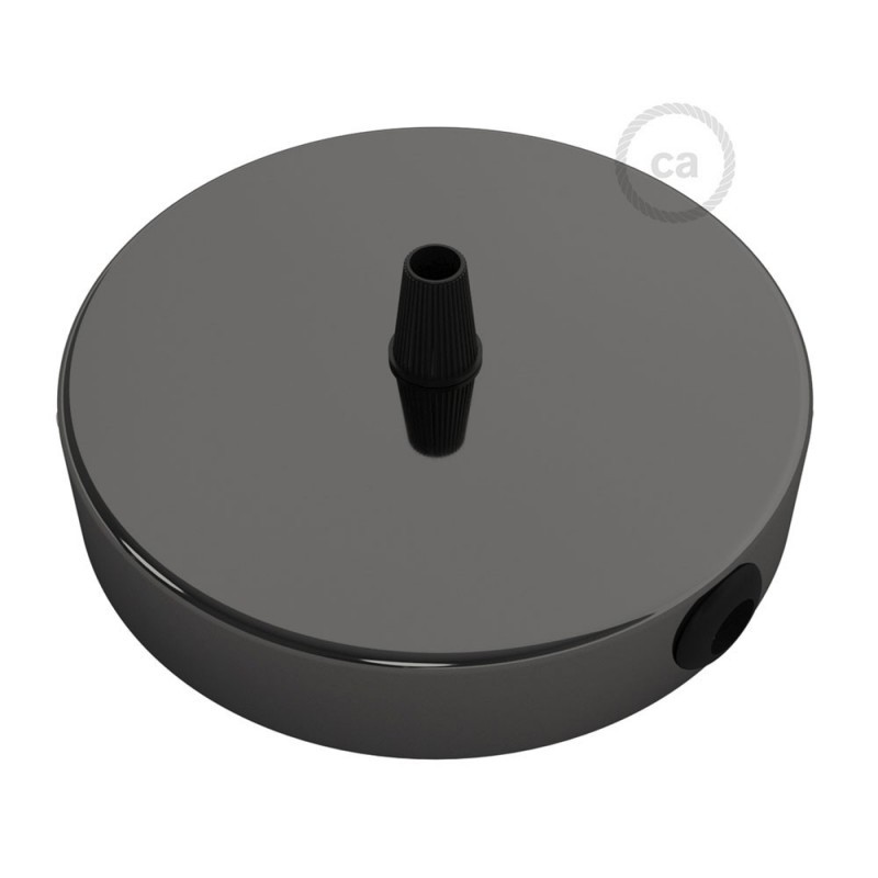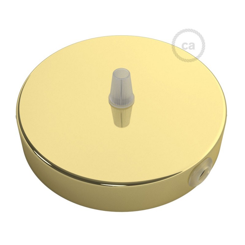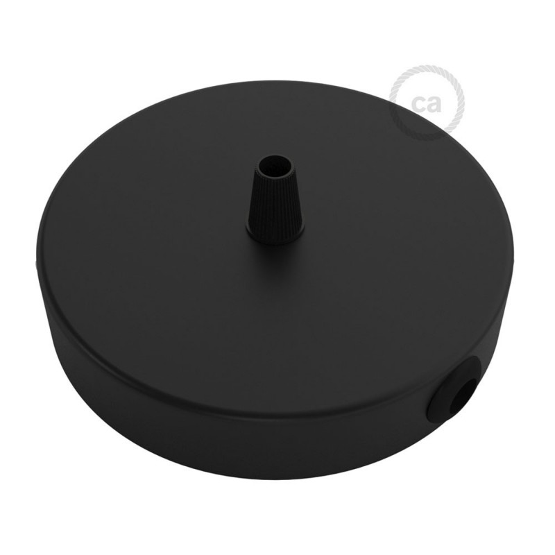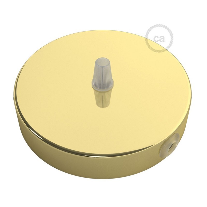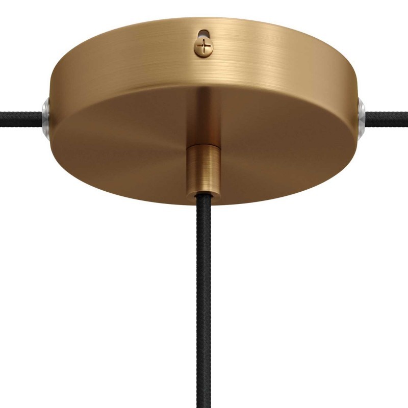 Un kit de rosetón de metal con un agujero central y dos agujeros laterales se utiliza para montar una lámpara de pared o techo con tres puntos de luz.