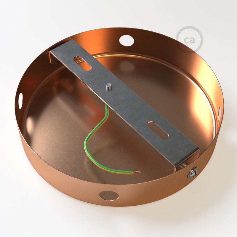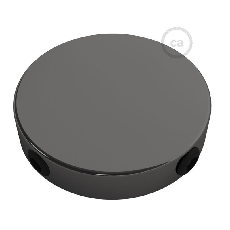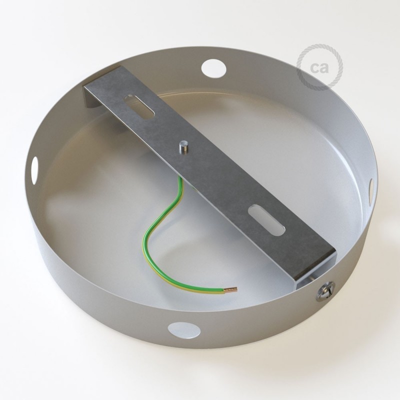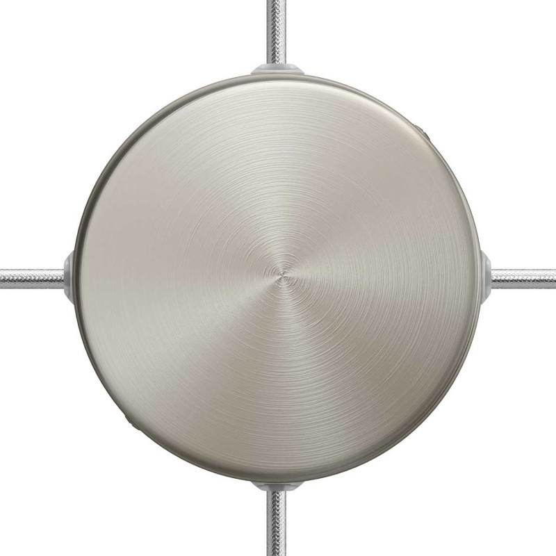 Un kit de rosetón de metal con cuatro agujeros laterales se utiliza para montar una lámpara de pared o techo con cuatro puntos de luz.