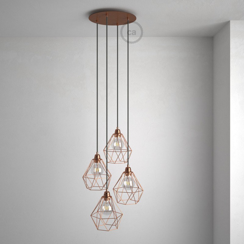 El rosetón XXL a 4 agujeros permite la creación de lámparas colgantes de gran efecto. La dimensión importante (diámetro 35 centímetros) permite una mayor distancia entre los agujeros y, por tanto, la posibilidad de realizar caídas con accesorios como pantallas o jaulas.